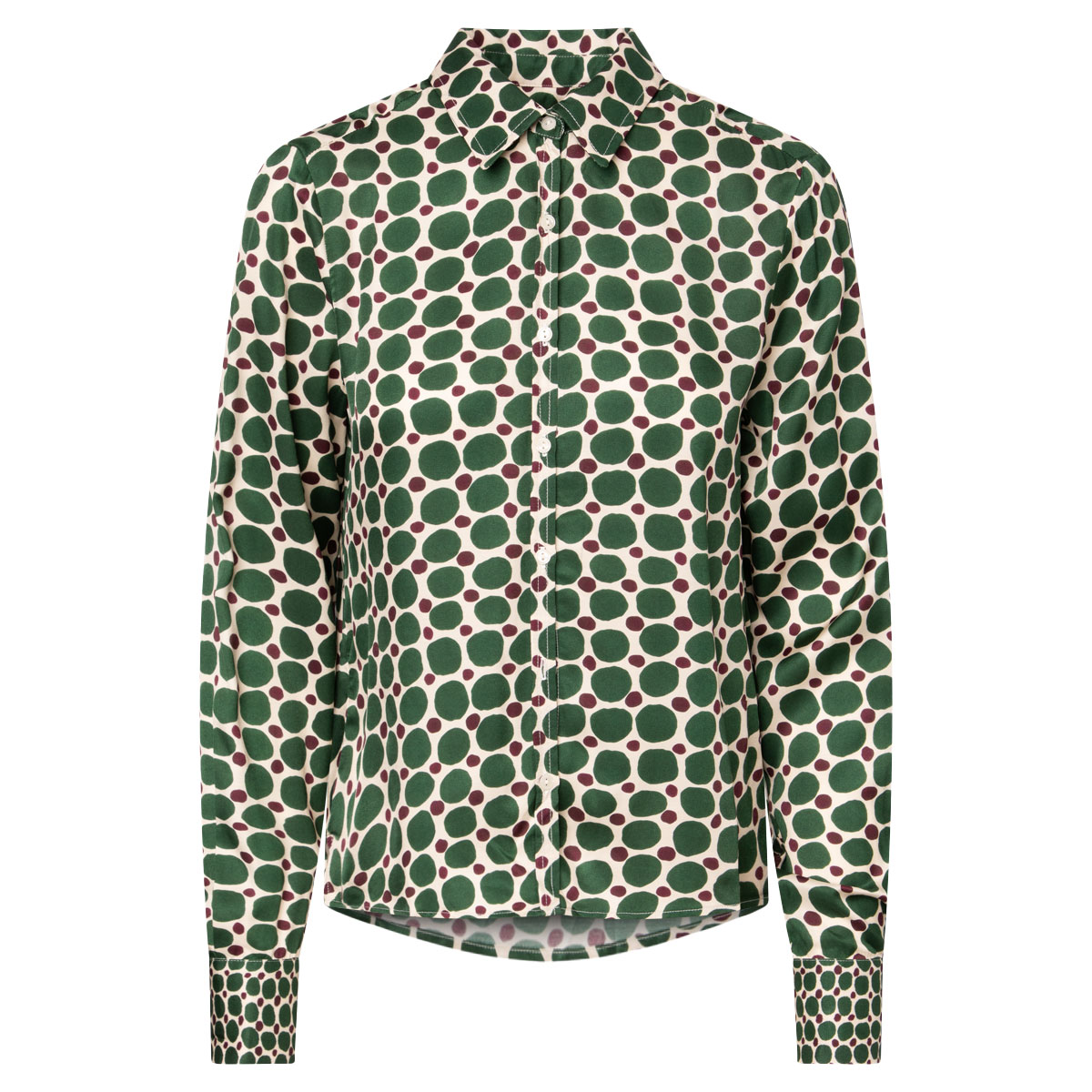0039 Italy Bluse “Sia” Grün. Die Bluse „Sia“ von 0039 Italy in Grün hat einen geraden Schnitt und einen klassischen Hemdblusenkragen. Sie verfügt über eine durchgehende, aufgesetzte Knopfleiste sowie lange Ärmel mit einer Zweiknopf-Manschette. Der Saum ist abgerundet und die Rückenpartie leicht verlängert, was eine schmeichelhafte Silhouette erzeugt. Ein Allover-Print verleiht der Bluse eine stilvolle Optik und das fließende Material sorgt für einen angenehmen Tragekomfort. Das Gewebe besteht zu 100% aus Viskose.
