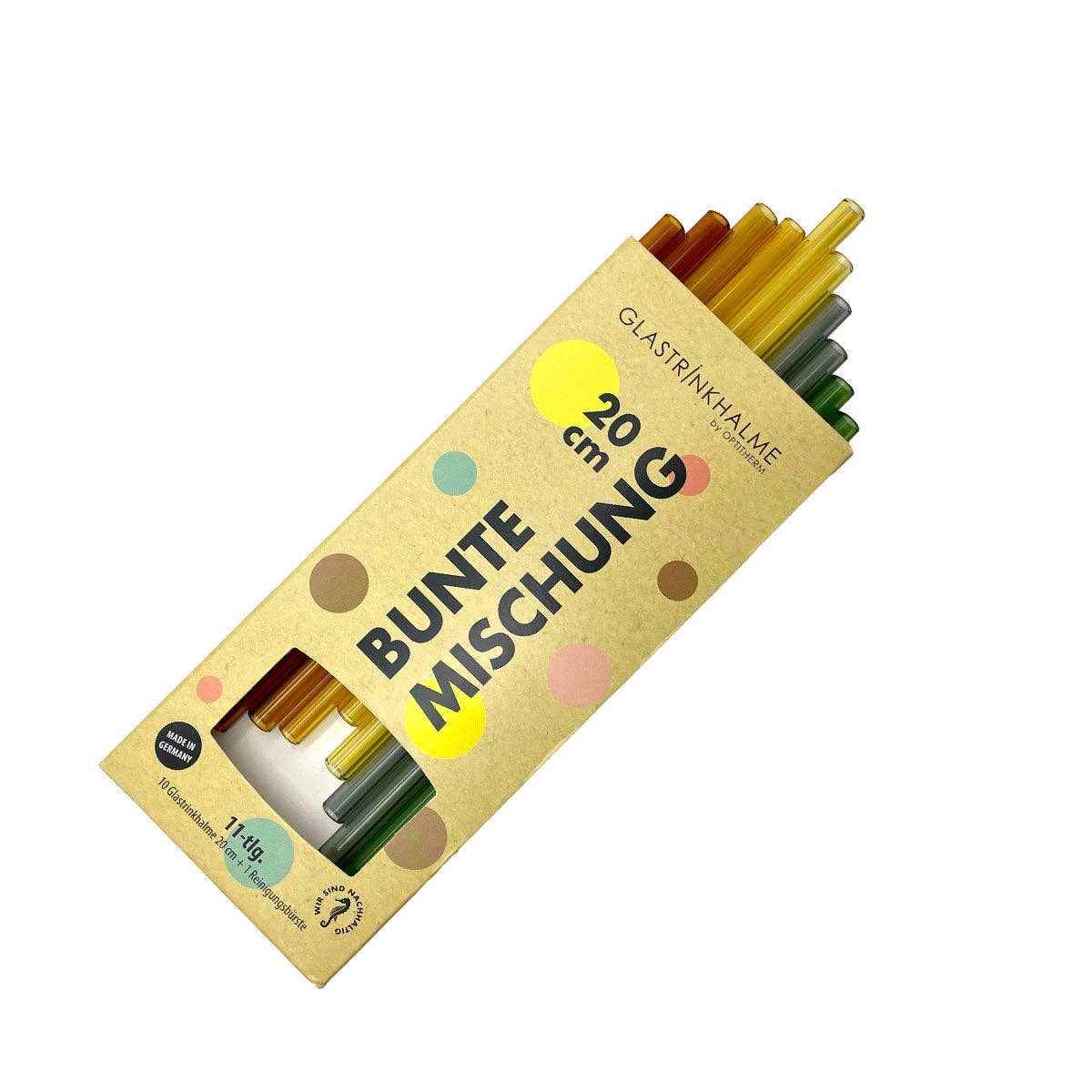 Im „Bunte Mischung“-Set enthalten sind 10 farblich und klar sortierte Glastrinkhalme (20 cm, gerade; 2x Amber, 2x Light Amber, 2x Gelb, 2x Grau, 2x Grün) und eine Reinigungsbürste aus Nylon.