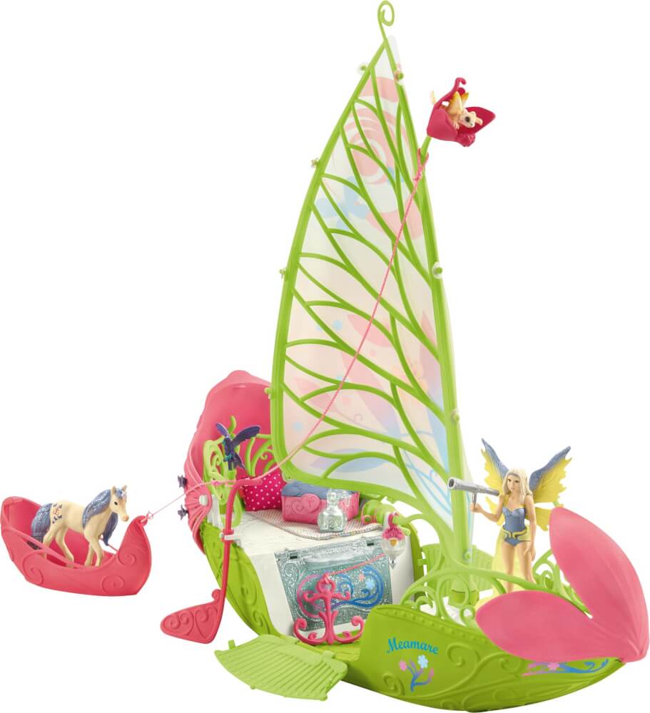 Seras magisches Blütenboot sieht nicht nur wunderschön aus, Du kannst darauf auch viel entdecken. Zum Beispiel eine Schatztruhe, die du hinter einer geheimen Klappe verstecken kannst und vieles mehr. Mit an Bord sind das lustige Flughörnchen, das im Ausguck Ausschau nach neuen, magischen Abenteuern hält und das Du über ein Seil zu den anderen an Deck herunterrutschen lassen kannst. Und das süße Einhornfohlen, das zwar am liebsten im kleinen Beiboot mitfährt, aber auch gerne an Bord zu Gast ist. Gemeinsam könnt ihr auf dem Sonnendeck die Aussicht genießen. Nachts verwandelt es sich mit dem Verdeck in einen gemütlichen Ort zum Schlafen. Dort, wo es euch gefällt, kannst du einfach den Anker werfen. Viel Spaß auf eurer Abenteuerreise über das Meer deiner Fantasie. Die Schleich® Figuren sind alle detailgetreu modelliert und stehen für pädagogisch wertvolles Spielen.