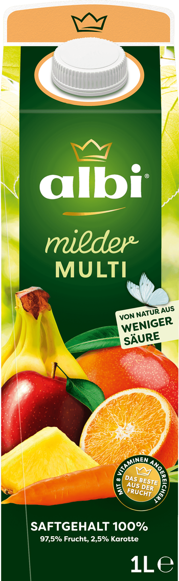 Das Multivitamin-Talent enthält natürliches Provitamin A aus der Karotte sowie 8 zugesetzte Vitamine. Er ist voll-fruchtig aber mild im Geschmack, weil er von Natur aus weniger Säure hat.