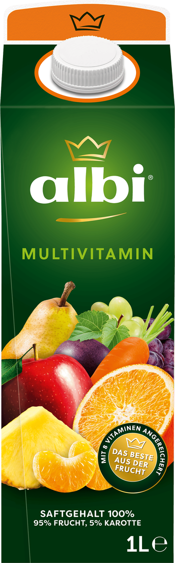 albi Multivitamin ist komponiert aus Karottensaft und 14 köstlichen Früchten: Apfel, Mandarine, Ananas, Orange, Trauben, Zitrone, Birne, Passionsfrucht, Limette, Banane, Pfirsich, Guave, Mango und Papaya. Natürliches Beta-Carotin aus der Karotte sowie 8 angereicherte Vitamine unterstützen einen guten Start in den Tag.