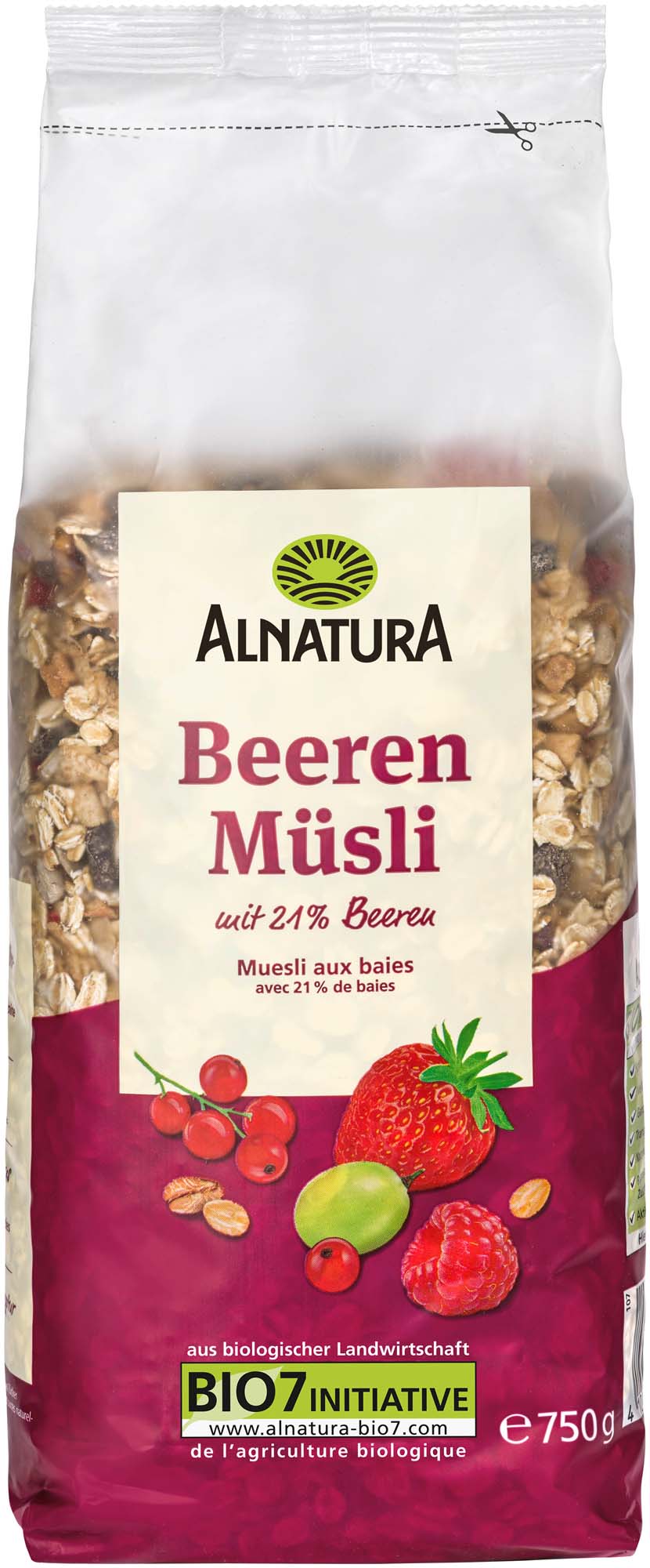 Eine fruchtig-beerige Kombination für den Frühstückstisch: Hafervollkornflocken sind die Basis des Alnatura Beerenmüsli, gefriergetrocknete Erdbeeren, Himbeeren und rote Johannisbeeren sorgen für das besondere Aroma. Die Süße stammt nur aus den enthaltenen Früchten (Zutaten enthalten von Natur aus Zucker). Die Rezeptur enthält ausschließlich Bio-Zutaten und ist vegan.