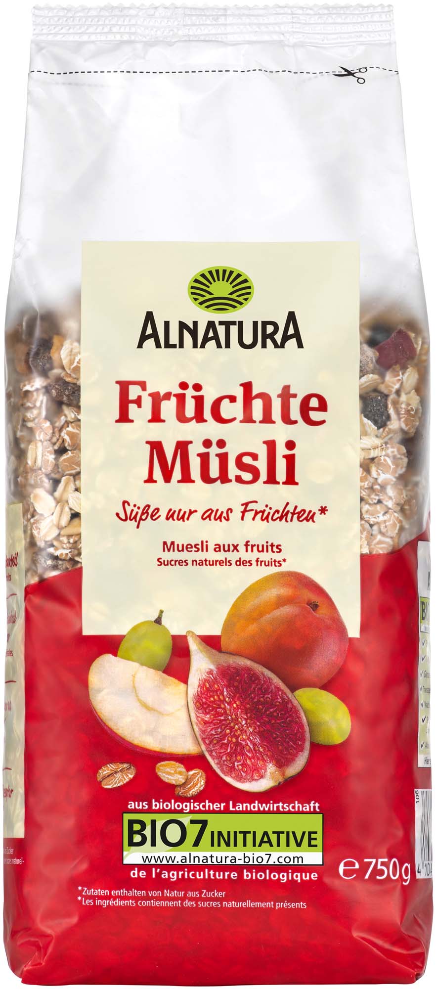 Eine fruchtige Kombination aus Getreidevollkornflocken und 40 Prozent aromatischen Trockenfrüchten wie Sultaninen, Weinbeeren, Aprikosen und Äpfeln. Die Süße des Frühstücksklassikers stammt ausschließlich aus den Früchten (diese enthalten von Natur aus Zucker). Alle Zutaten für das Alnatura Früchtemüsli stammen aus Bio-Landwirtschaft. Die Rezeptur ist vegan.
