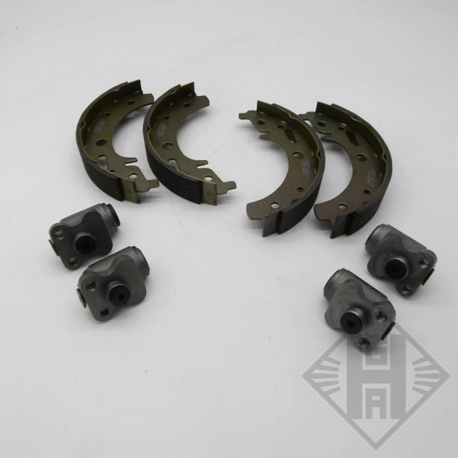 Zur Reparatur Ihrer Vorderradbremse erwerben Sie hier ein neues Bremsenset passend für den Trabant 601. Der Bremsensatz enthält den Bremsbackensatz für vorn, geeignet für den Bremstrommeldurchmesser von 200mm, die Belagbreite ist 30mm. Ebenfalls enthalten sind die vier Radzylinder für die Vorderachse rechts und links, mit einem Kolbendurchmesser von 22,2mm, mit Kolben und Manschetten. Die Bremszylinder sind seitengebunden, dies ist durch die Kerbe im Gehäuse gegeben. Es handelt sich um Neuteile aus aktueller Fertigung.