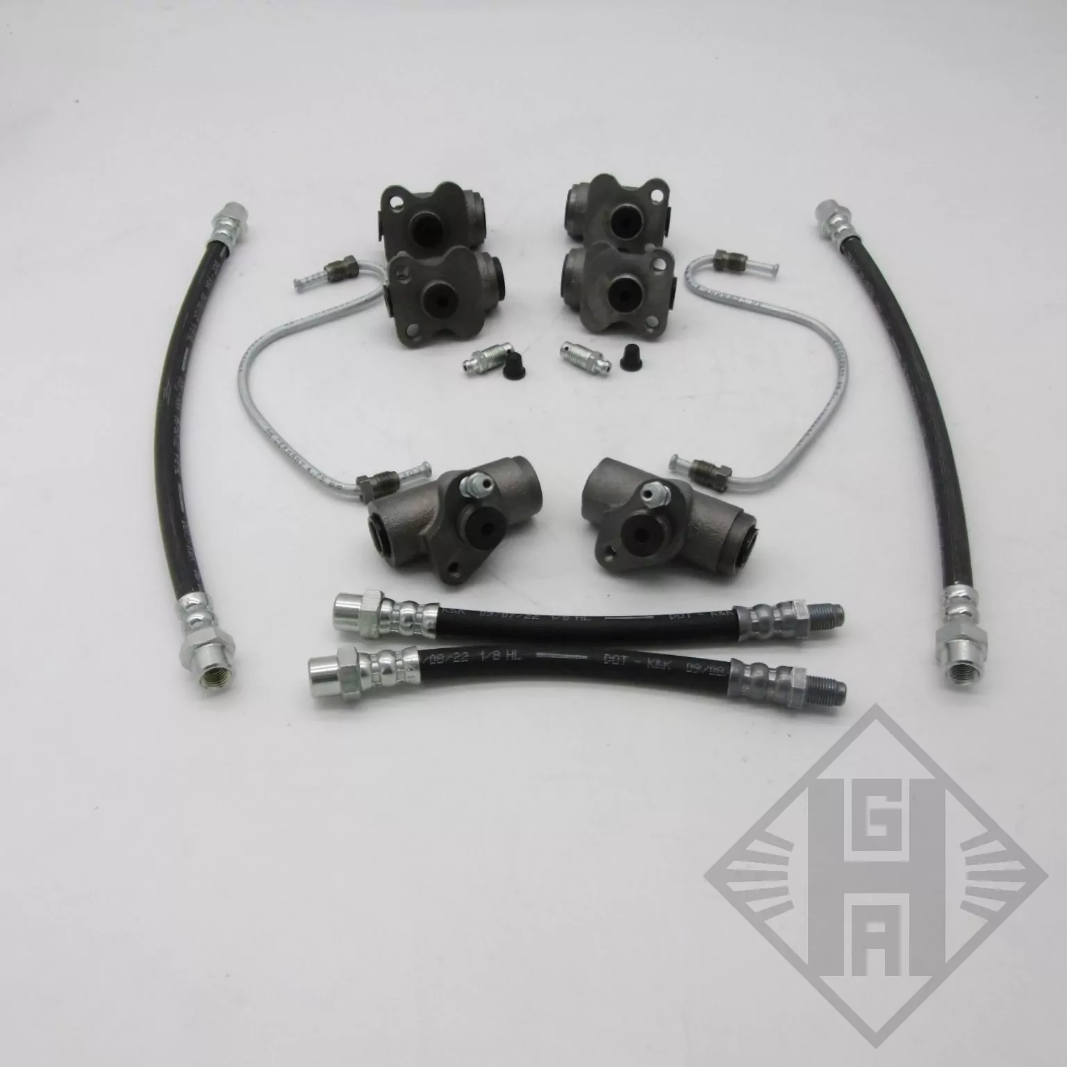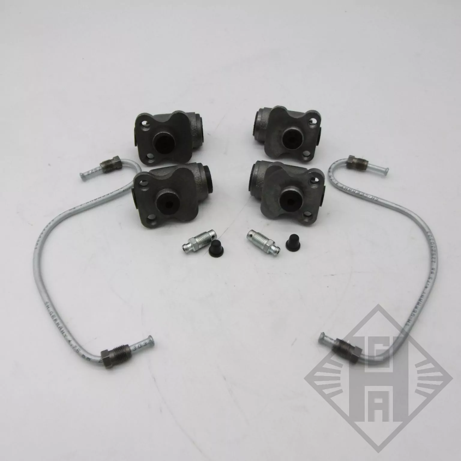 Zur Reparatur Ihrer Bremse am Trabant 601 erhalten Sie hier ein neues Bremsenset. Der Bremsensatz enthält vier Radbremszylinder für die Vorderachse, je zwei für rechts und zwei für links mit jeweils einer Entlüfterschraube und Abdeckkappe, sowie zwei Radzylinder für die Hinterachse. Ebenfalls geliefert werden zwei Bremsleitungen die sich in der Vorderradbremse befinden und die Bremszylinder vorn verbinden. Auch vier Bremsschläuche, zwei für vorn und zwei für die Hinterachse sind im Lieferumfang enthalten. Es handelt sich um Neuteile aus aktueller Fertigung.