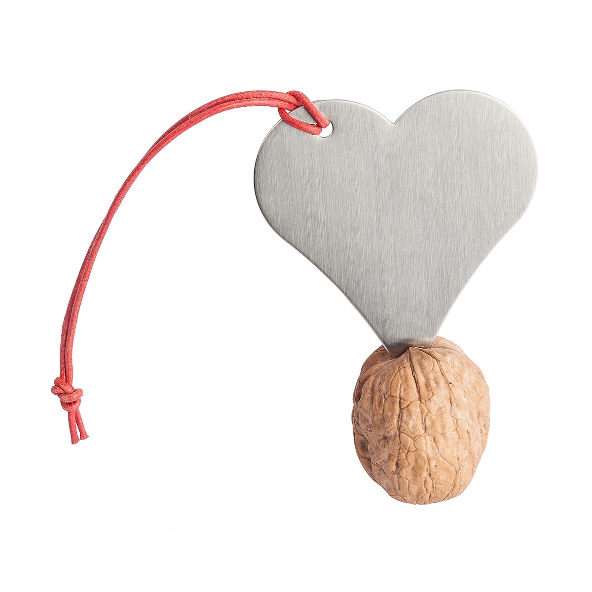 Der herzförmige Nussknacker aus Edelstahl von Designimdorf hängt an einem roten Lederband und knackt ganz leicht und im Handumdrehen alle Walnüsse. Funktioniert bestens! Einfach den Punkt des Herzens in das Weiche der Nuss stecken und einmal um 180° drehen.