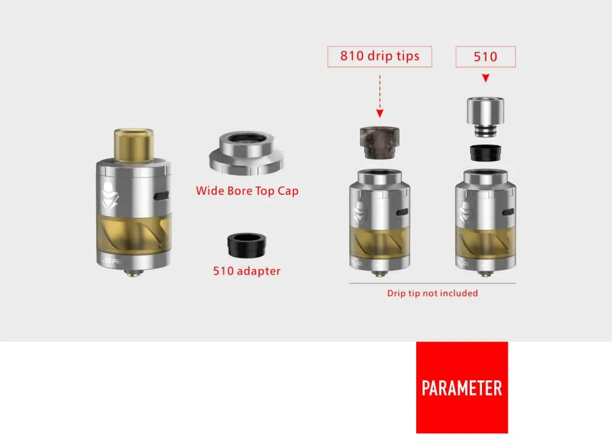 Steigen später die Ansprüche nach mehr Dampf, DL und höheren Leistungen, wird der Pilgrim einfach entsprechend angepasst. Hiermit kommt dann die zweite Wicklung im Austausch zu dem Silikonadapter, die Einstellung der Airflow auf beide Wicklungen und die Verwendung der beiliegenden Topcap mit der größeren 810er Wide Bore Öffnung für das DL subohm-Dampfen ins Spiel. Achtung: das 810er Drip Tip gehört nicht zum Lieferumfang!