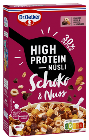Ob als genussvoller Start in den Tag oder kleiner Snack zwischendurch: das High Protein Müsli Schoko & Nuss ist die köstliche Kombination aus wertvollen Flocken, feiner Schokolade und knackigen Haselnüssen und Mandeln. Mit 30% Protein, einem hohen Ballaststoffgehalt sowie Magnesium fügt sich das schokoladig-knusprige Müsli ideal in den Rahmen einer bewussten Ernährung und eines aktiven Lifestyles ein. Löffel für Löffel ein Hochgenuss!