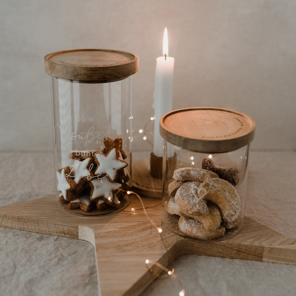 Eulenschnitt Vorratsglas “Süßes Leben”. Entdecke das wunderschöne und praktische Vorratsglas. Dieses Glas bestehen aus hochwertigem und strapazierfähigem Borosilikatglas und ist mit dem Spruch “So ein süßes buntes Leben” veredelt. Es wird mit einem Akazienholz Deckel geliefert, der das Logo und das Motto von Eulenschnitt – “Konfetti für die Seele” – eingraviert hat. Borosilikatglas ist ein sehr robustes Material, das spülmaschinenfest und zu 100% recyclebar ist. Die Deckel werden aus unbehandeltem Akazienholz gefertigt, sodass jeder Deckel ein Unikat ist und einzigartig in seiner Struktur. Ein Silikonring zum luftdichten Verschließen ist natürlich auch mit dabei.