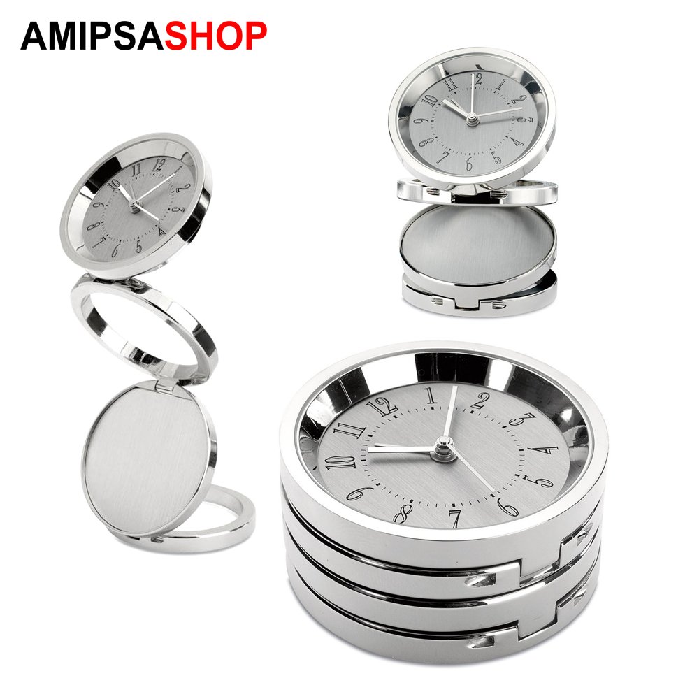 Faltbare Teleskop-Tischuhr in glänzender Metalloptik.Inklusive einer Knopfzelle. Größe: D6X2,95 cm