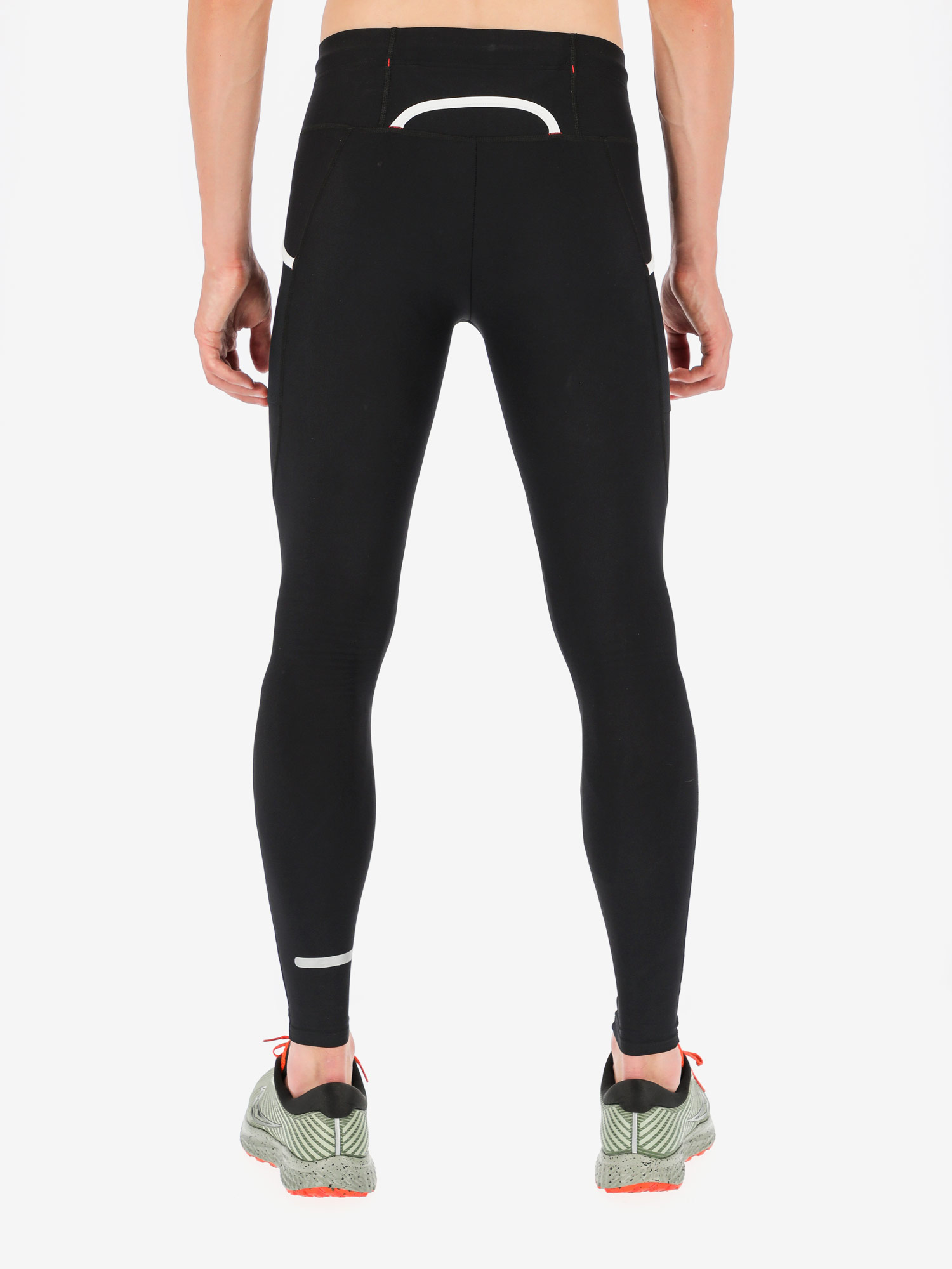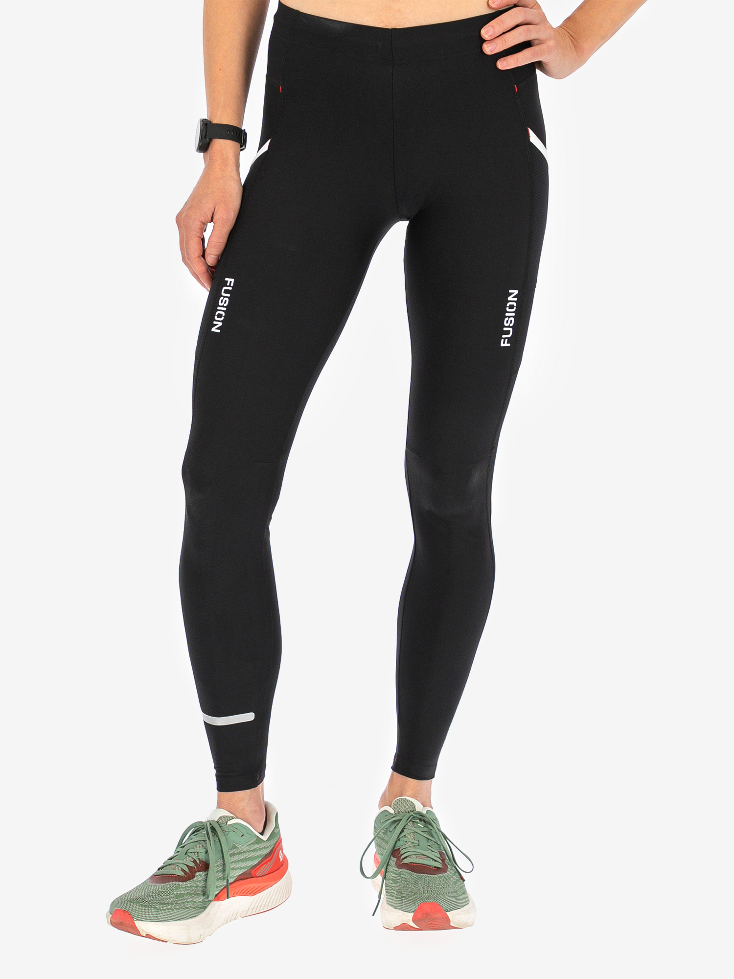 Die Hot Long Tights haben einen breiten Hüftgummi mit verstellbarer Kordel und eine kleine Tasche auf der Rückseite sowie die funktionalen Fusionstaschen auf den Oberschenkeln, die den Inhalt eng am Körper halten, ohne die Bewegung während der Aktivität zu stören.