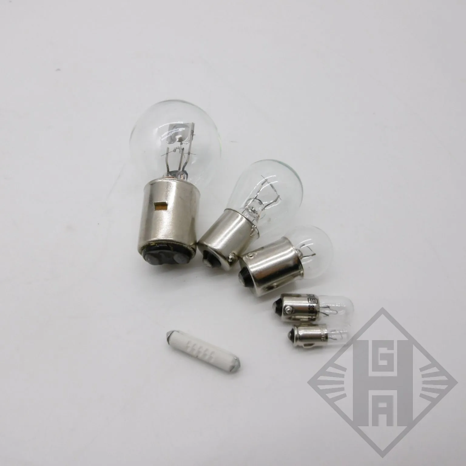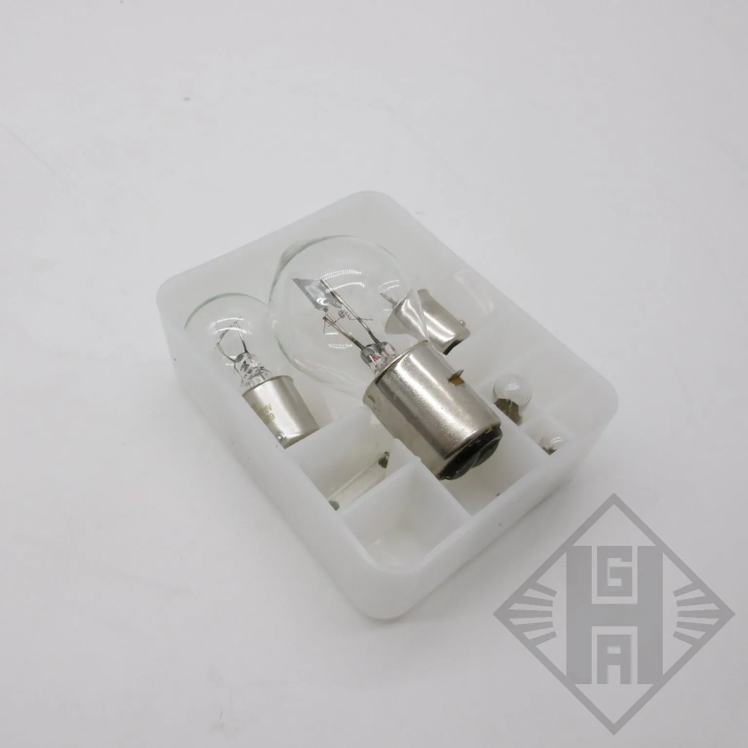 Hier kaufen Sie einen neuen Glühlampenkasten verwendbar für die Mopeds S50, S51, KR51/2 und Roller SR50. Enthalten in diesem Glühlampensortiment sind 6 Volt Glühbirnen 1,2W Ba7s, 4W Ba9s, 5W Ba15s, 21W Ba15s, 25/25W Ba20d sowie eine Schmelzsicherung 8 Ampere. Der Ersatzbirnenkasten ist ein neuer Lagerartikel, welcher Lagerspuren aufweisen kann.