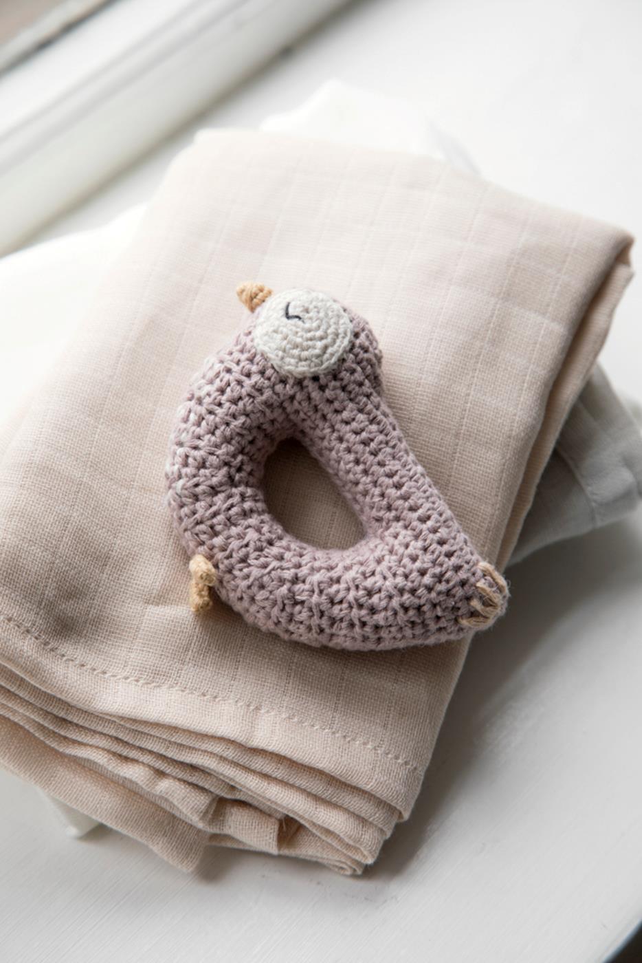 Diese Rassel verfügt über die Form eines kleinen Vogels, ist von Hand gehäkelt und im Inneren hat sie eine angenehm klingende Glocke, die klingt, wenn die Rassel geschüttelt wird. Die Rassel ist mit weichem recyceltem Polyester gefüllt, das in einem kleinen Stoffbeutel eingeschlossen ist, der verhindert, dass die Füllung zwischen den Garnmaschen hervorquellen kann. Kann als Rassel verwendet werden und später, wenn das Kind älter ist, kann diese auch als Spieltier zum Einsatz kommen. Bliss der Vogel verfügt über eine hübsche staubrosa Farbe mit weißen und beigen Details.