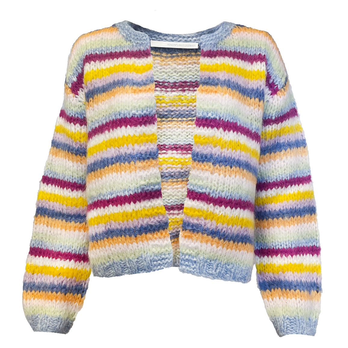 Herzen´s Angelegenheit Cardigan “Water Drop Multi”. Der Cardigan “Water Drop Multi” von Herzen’s Angelegenheit bringt Farbe, Wärme und Stil in Deine Garderobe. Mit seinem farbenfrohen Multicolor-Design wird er zum echten Hingucker – perfekt für individuelle Looks mit Wohlfühlfaktor. Dank des hochwertigen Materialmixes mit Mohair, Wolle, Alpaka und Polyamid fühlt sich der Cardigan besonders weich und flauschig an. Die langen Ärmel und der lockere Schnitt machen ihn zum idealen Begleiter für kühlere Sommertage – ob gemütlich zu Hause oder als stylisches Statement für unterwegs. Ein Lieblingsstück, das Stil und Komfort harmonisch vereint – und garantiert gute Laune in Deinen Alltag bringt.