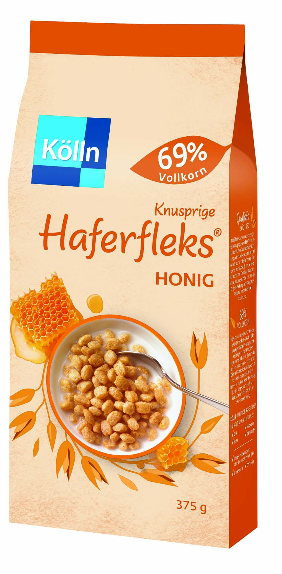 Honigsüßer Hafervollkorn-Genuss. Der hohe Gehalt an Hafervollkorn (69 %) und die feine Honignote machen Kölln Knusprige Haferfleks® Honig zu einem knusprigen und schmackhaften Frühstücksspaß. Sie sind reich an Ballaststoffen und enthalten von Natur aus Magnesium, Eisen und Zink.