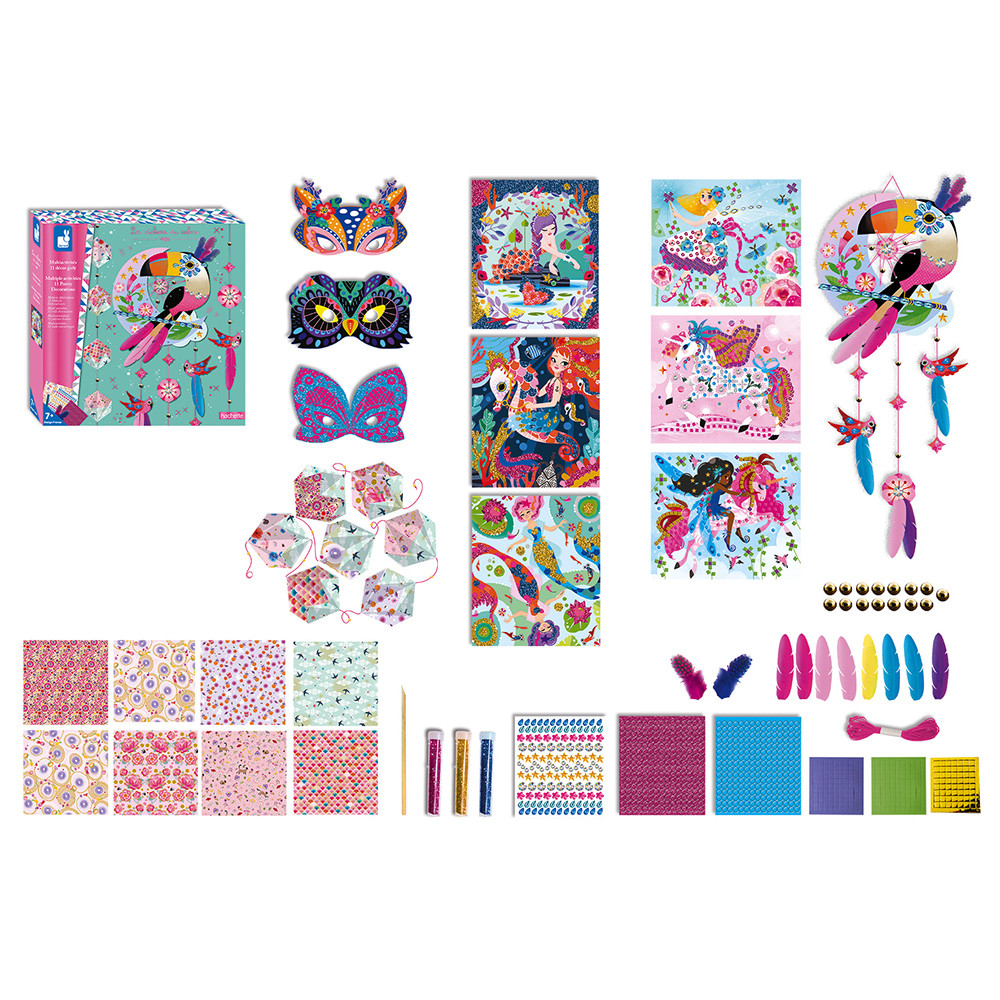 Janod Kreativ Set 11 hübsche Dekorationen : Inhalt: 6 Bilder, 3 Maksen,1 Traumfänger, 1, Girlande, Moaikteilchen, Pailettenröhrchen, Strasssteine, Federn, Perlen, Origamiblätter, Nähgarn