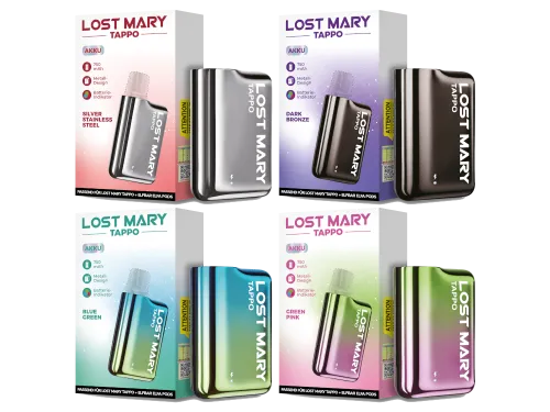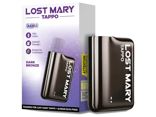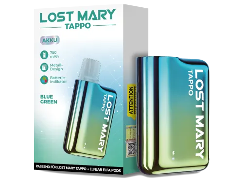 Der Lost Mary Tappo Akku ist ide Energiequelle für ihre Lost Mary Tappo Pods. Er hat eine Kapazität von 750mAh und ist in der Tappo fest verbaut. Der integrierte LED Indikator zeigt ihnen den genauen Ladestand des Akkus an. Für den Ladestand steht die Farbe Grün für 100% bis 50%; blau für 50% bis 20% und rot unter 20%. Über ein USB-C Kabel wird der Akku wieder aufgeladen. Der Lost Mary Tappo Akku wird auf Zug am Mundstück gestartet. Das Gerät selber benötigt keine Tasten oder sonstige Bedienelement. Dadurch ist seine Handhabung, auch gerade für den Einsteiger geeignet. Akku und Pod werden ganz einfach nur zusammengesteckt. Den Tappo Akku bibt es in 4 verschiedenen Farben: blau-grün; bronze; grün-pink und silber. Außerdem ist er zu 100% kompatibel mit den Elfbar Elfa Pods.