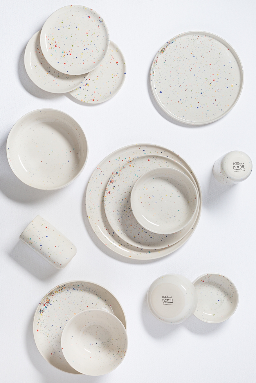 Die Party-Kollektion besteht aus einer speziellen Glasur, die Bereiche aufweisen kann, in denen sich aufgrund der reaktiven Natur des Glases während der Verarbeitung Flecken diffundieren.