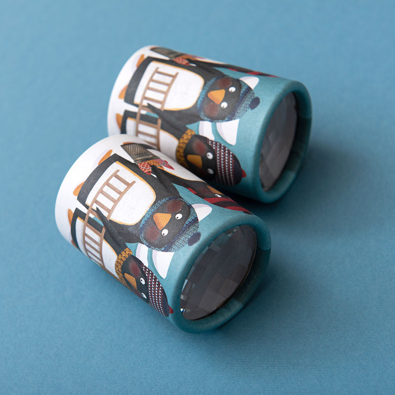 Eine Fliegenaugelinse mit Pinguin-Illustrationen, um Sie wie ein Insekt sehen zu lassen. Ein ideales Kaleidoskop zum Erkunden und auf Reisen.