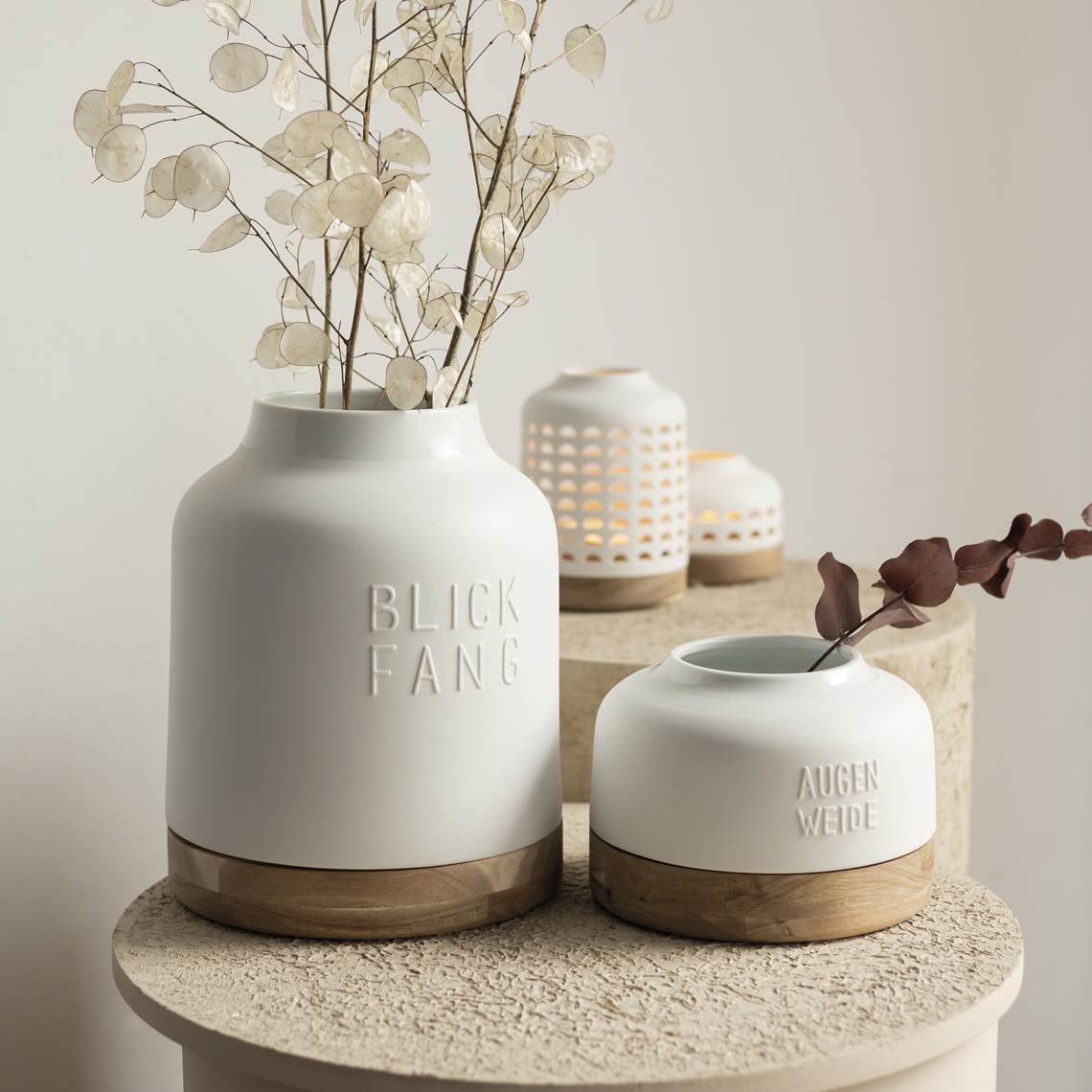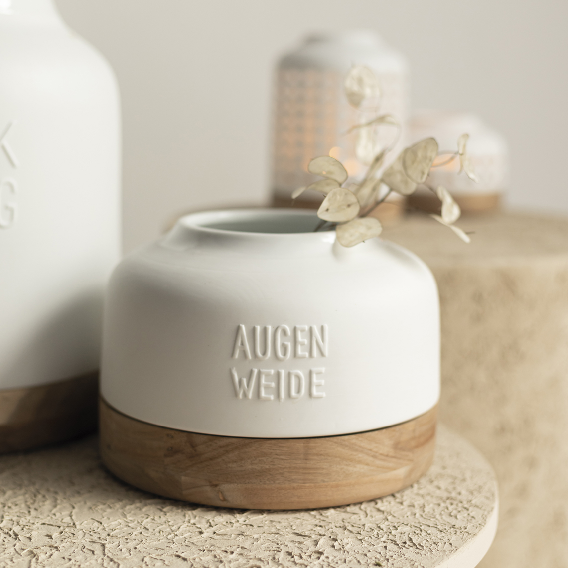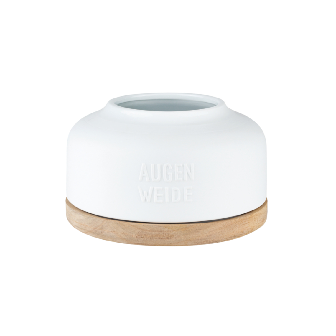 Räder Vase “Augenweide”. Eine wunderschöne Vase für dein Zuhause. Mit dem schlichten Farbton in weiß und der feinen Aufschrift “Augenweide” passt sie an jede Stelle in Deinem Zuhause. Schmücken kannst du sie mit bunten Blumen oder feinen Zweigen. Der Holzfuß gibt ihr das gewisse Etwas.
