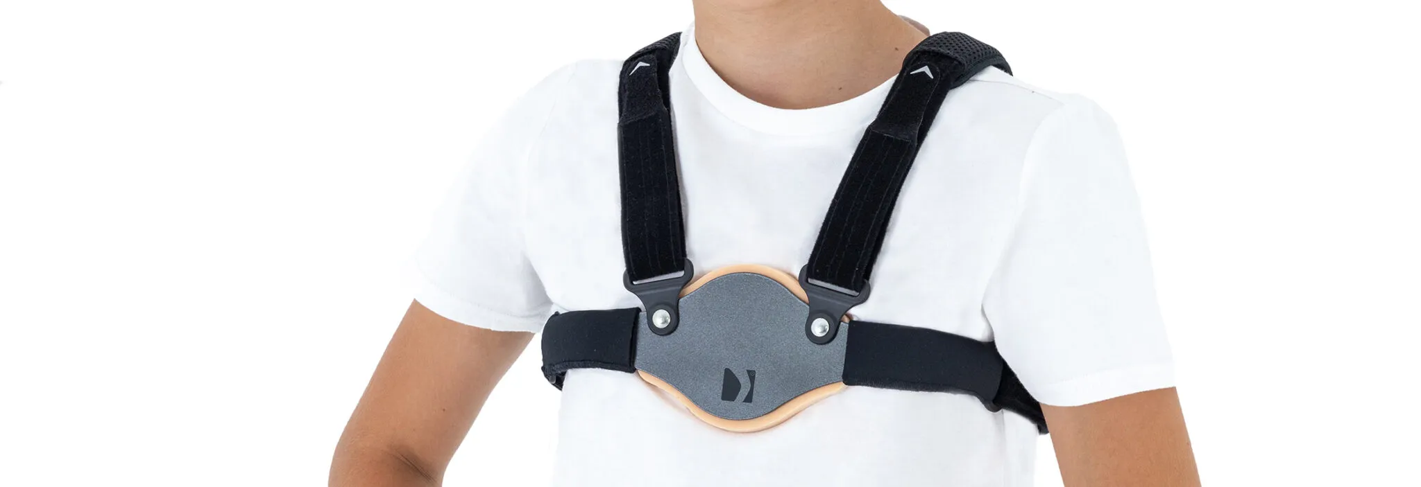 Die Kippbrustbandage besteht aus hochwertigem, ultraleichtem Aluminium, das auch in der Luftfahrt verwendet wird und eine optimale Stabilisierung bietet. Sie wird um den Brustkorb getragen und übt Druck auf Vorder- und Rückseite aus, um das Brustbein in eine neutrale Position zu bringen. Die Bandage verfügt über weiche Polster, die Kontakt mit der Brust Ihres Kindes haben, für zusätzlichen Komfort.