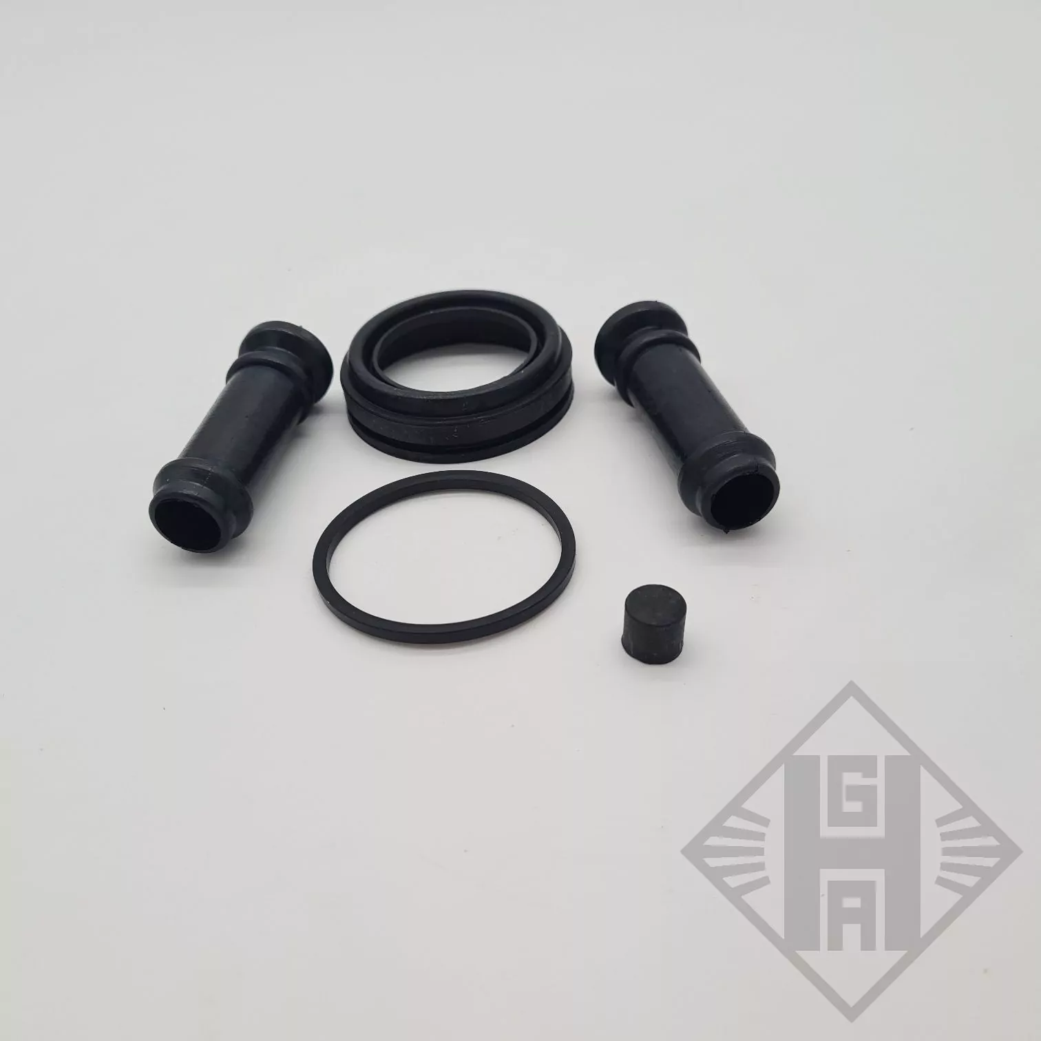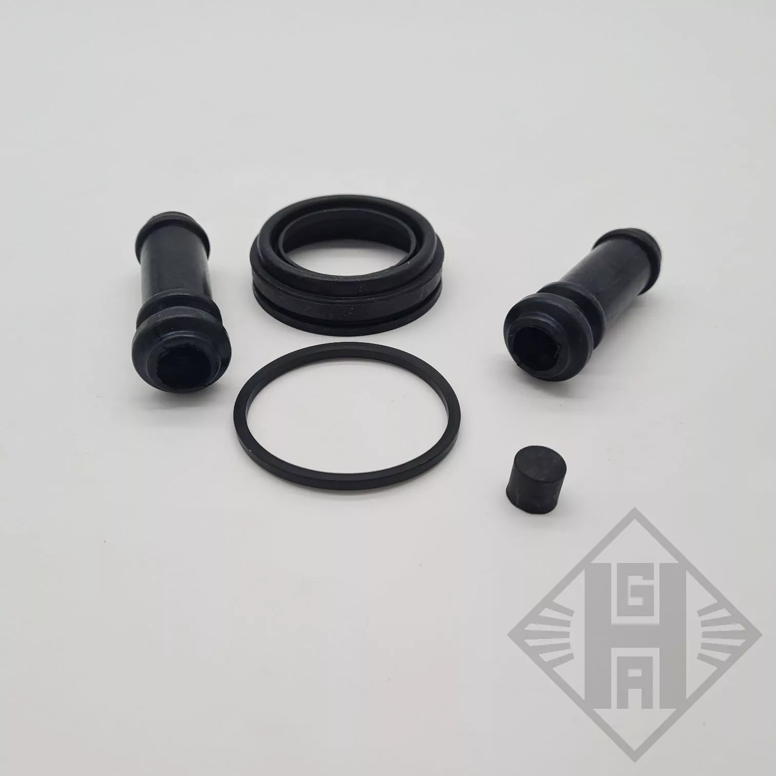 Der Dichtungssatz besteht aus 2 Buchsen für die Führungsbolzen, einer Dichtmanschette, einem Rechteckring und einer Abdeckkappe.