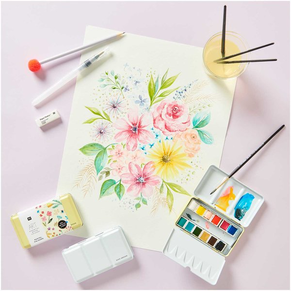 Aquarellmalen ist ein riesiger Trend, nicht nur bei Künstlern, sondern auch bei Hobby-Malern. Erfolgreiche Blogger zeigen auf social media-Plattformen wie es geht, malen florale Bilder, Landschaften und Letterings mit tollen Aquarellverläufen und Tausende Follower machen es nach. Für Hobby-Maler und die, die es ausprobieren wollen, eignen sich die ART Essential Aquarellfarben in Hobbyqualität. Der Aquarellkasten enthält 12 aufeinander abgestimmte Farben in halben Näpfchen zum Farbthema „Pastell“. Als besonderes Highlight enthält das Set vier Effektfarben in Metallic- bzw. Neontönen. Die Farben überzeugen durch gute Lichtbeständigkeit und Wasserlöslichkeit, wodurch tolle Farbverläufe ermöglicht werden. Der hochwertige Metallkasten verfügt über einen praktischen Griff an der Unterseite zum besseren Halten und eine ausklappbare Palette zum Mischen der Farben. Außerdem ist eine Vorlage aus Aquarellpapier für eine Farbkarte zum selber Malen enthalten.