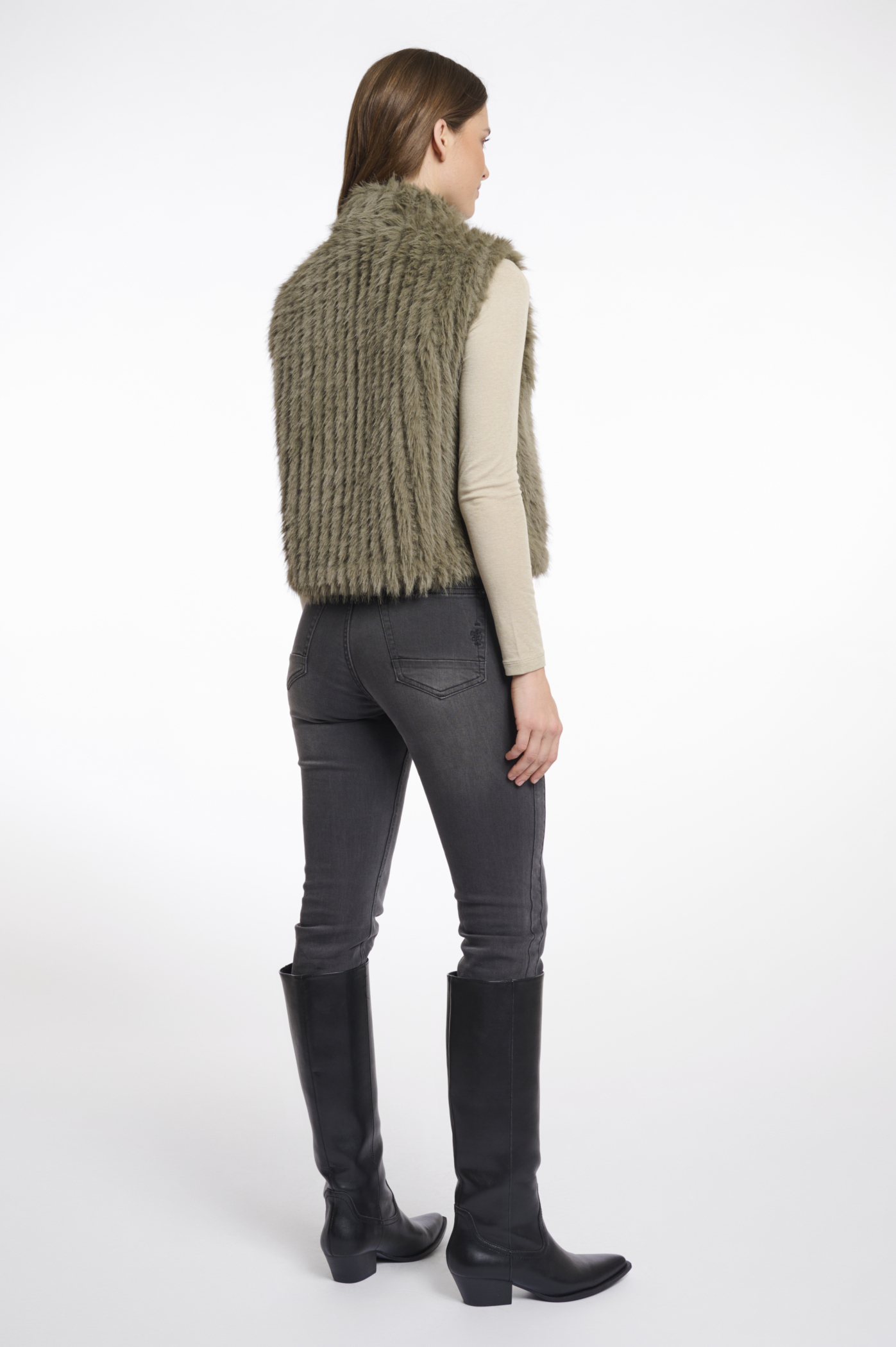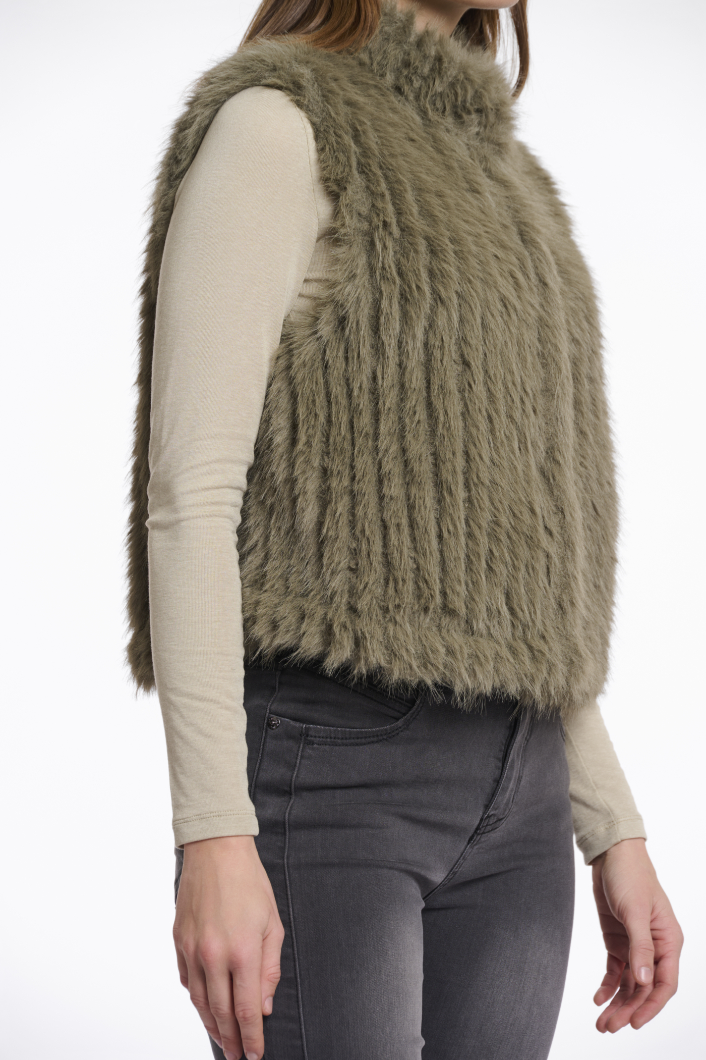 Rino & Pelle Kunstfellweste “Davia Greenash”. Stylen Sie Ihren Look mühelos mit dieser kurzen Kunstfellweste. Dieses Must-Have-Piece verleiht jedem Outfit mühelos Stil. Mit ihrem dezenten Stehkragen und dem Druckknopfverschluss auf der Vorderseite strahlt sie Raffinesse aus. Aber das Besondere ist das unwiderstehlich weiche Material, das zum Anfassen einlädt. Gönnen Sie sich Luxus und werten Sie Ihren Look mit dieser umwerfenden Weste auf.