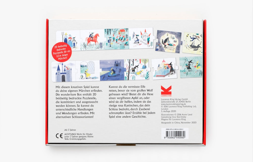 Dieses Spiel enthält 20 beidseitig bedruckte Puzzleteile, die untereinander ausgetauscht und verschieden kombiniert werden können. So lassen sich zahlreiche unterschiedliche Geschichten erfinden, mit drei alternativen Schlussvarianten!