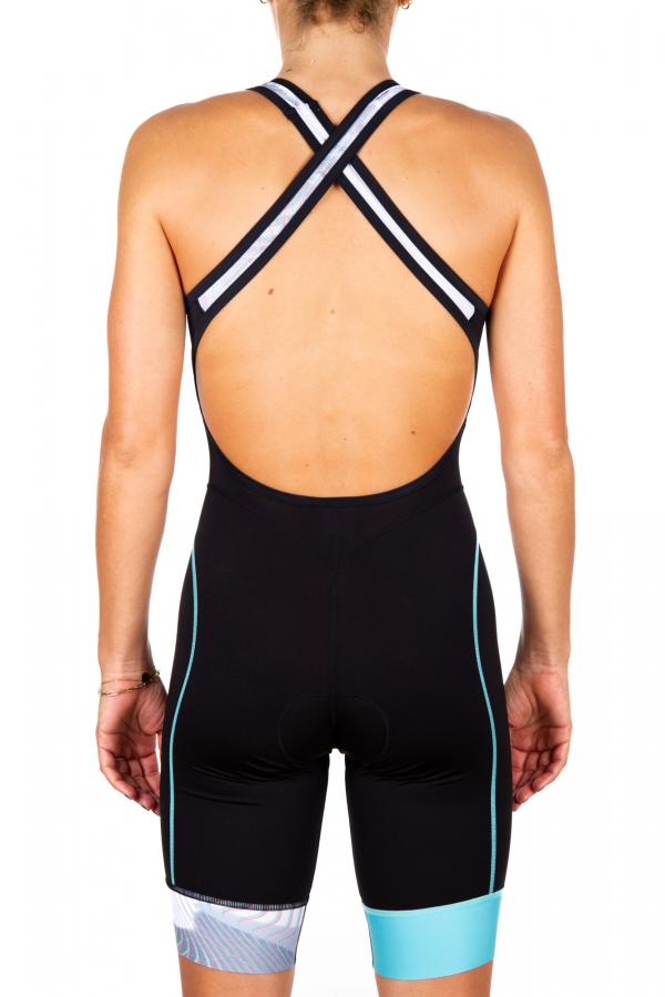 Glatte Bindungen um Arme und Hals und das in Italien hergestellte Tripad sorgen dafür, dass der Anzug sehr weich und bequem ist. Zwei Taschen an der Innenseite der Hosenträger an der Vorderseite des Anzugs ermöglichen die Energiespeicherung und machen diesen Trisuit ideal für jede Distanz, sowohl für Triathleten als auch für Duathleten. Sein gekreuzter, offener Rücken sorgt für großartigen Halt und schmeichelt der weiblichen Körperform.