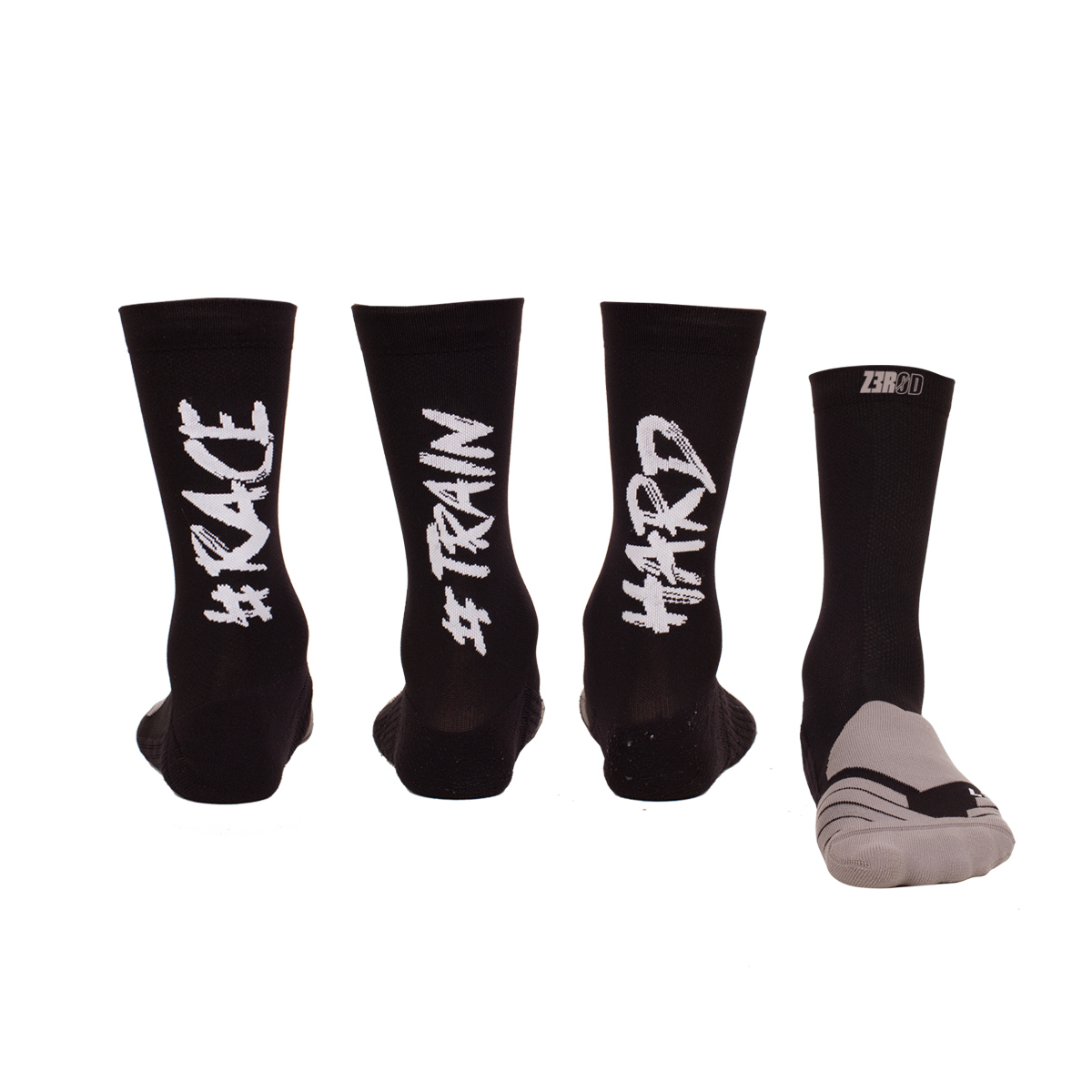Die neuen Z3R0D Triathlon Socken bestehen aus 3 Socken. Auf einer linken Socke steht: “#train”, auf einer zweiten linken Socke steht “#race” und auf der rechten Socke steht: “hard”. So kannst Du deine Socken kombinieren, je nachdem ob Du im Training oder im Wettkampf bist,